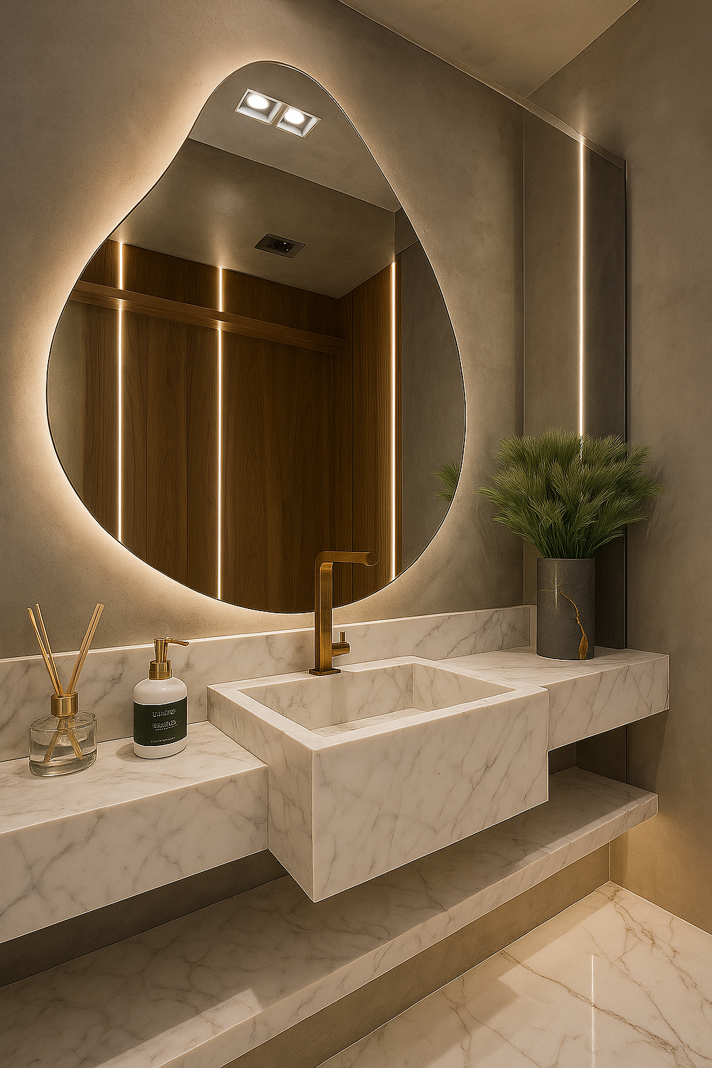 A luz desempenha papel fundamental no projeto, atravessando os ambientes e destacando texturas, materiais e a riqueza dos detalhes. Durante o dia, o espaço se abre para o entorno; à noite, a iluminação cênica revela novas camadas de aconchego, profundidade e refinamento.