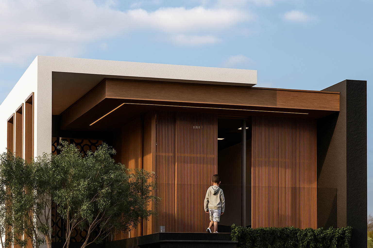A fachada integra madeira natural, grandes planos verticais e vazios arquitetônicos que filtram luz e sombra ao longo do dia — criando dinamismo, profundidade e poesia visual. A geometria imponente se contrapõe ao paisagismo suave, trazendo equilíbrio entre rigidez e natureza.
