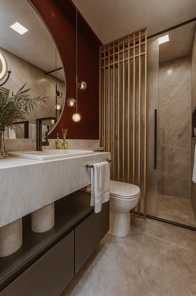 O banheiro surge como uma peça de destaque, com atmosfera cênica, paleta rica e elementos que dialogam entre forma e função — mostrando que espaços pequenos também podem ter grande presença.