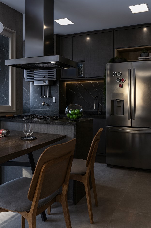 A cozinha integra-se naturalmente à sala, criando um eixo social fluido e acolhedor. Materiais sofisticados, marcenaria sob medida e iluminação bem pensada garantem elegância sem abrir mão da praticidade. A mesa generosa ao centro assume protagonismo: ela é palco para refeições, brindes, conversas sinceras e memórias em construção.