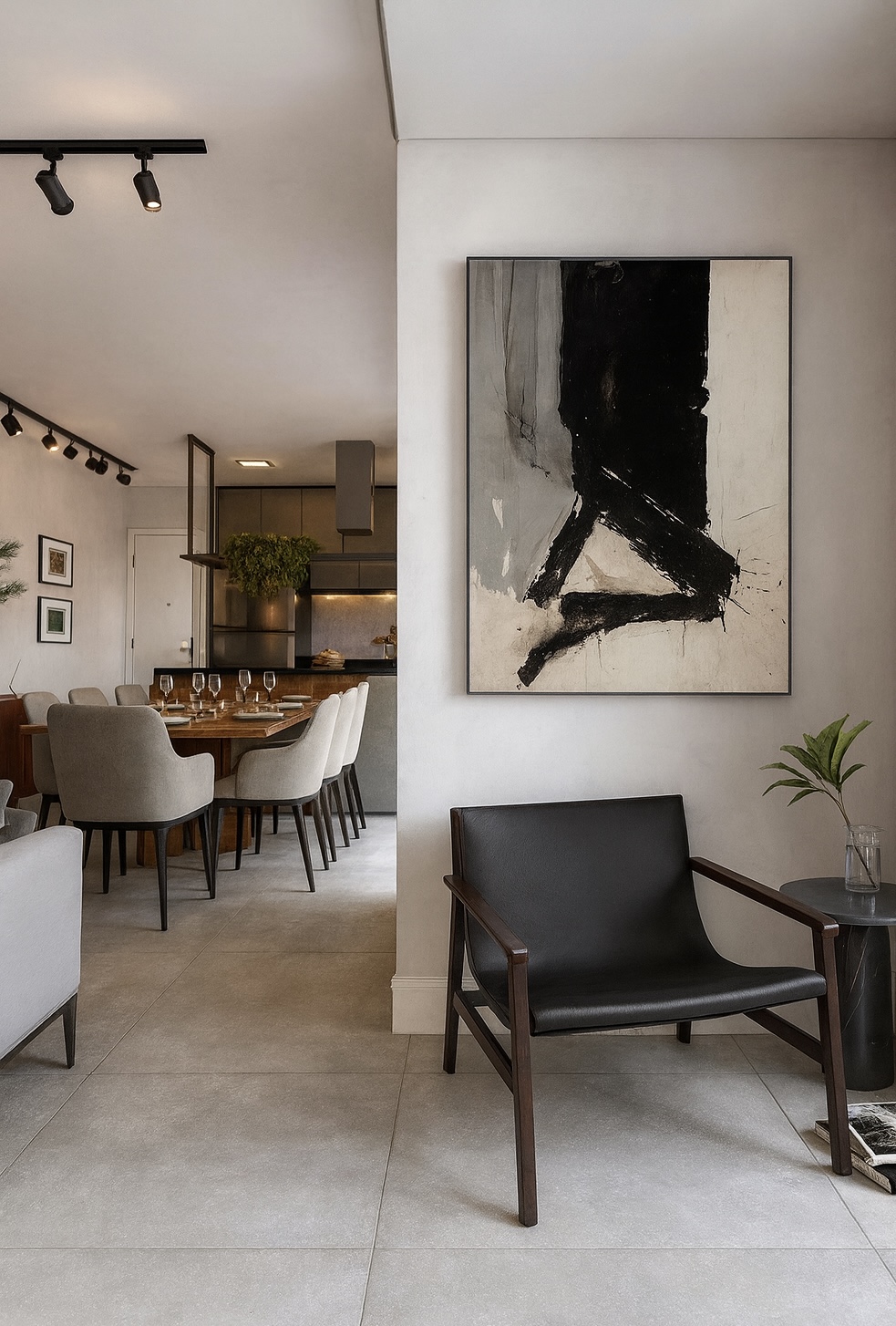 A área social integra estar, jantar e home office, criando um espaço fluido e acolhedor, com paleta neutra, texturas naturais e iluminação suave que valoriza formas e volumes. O resultado é um ambiente elegante, onde funcionalidade e estética caminham lado a lado, dando protagonismo ao cotidiano com naturalidade e sofisticação.