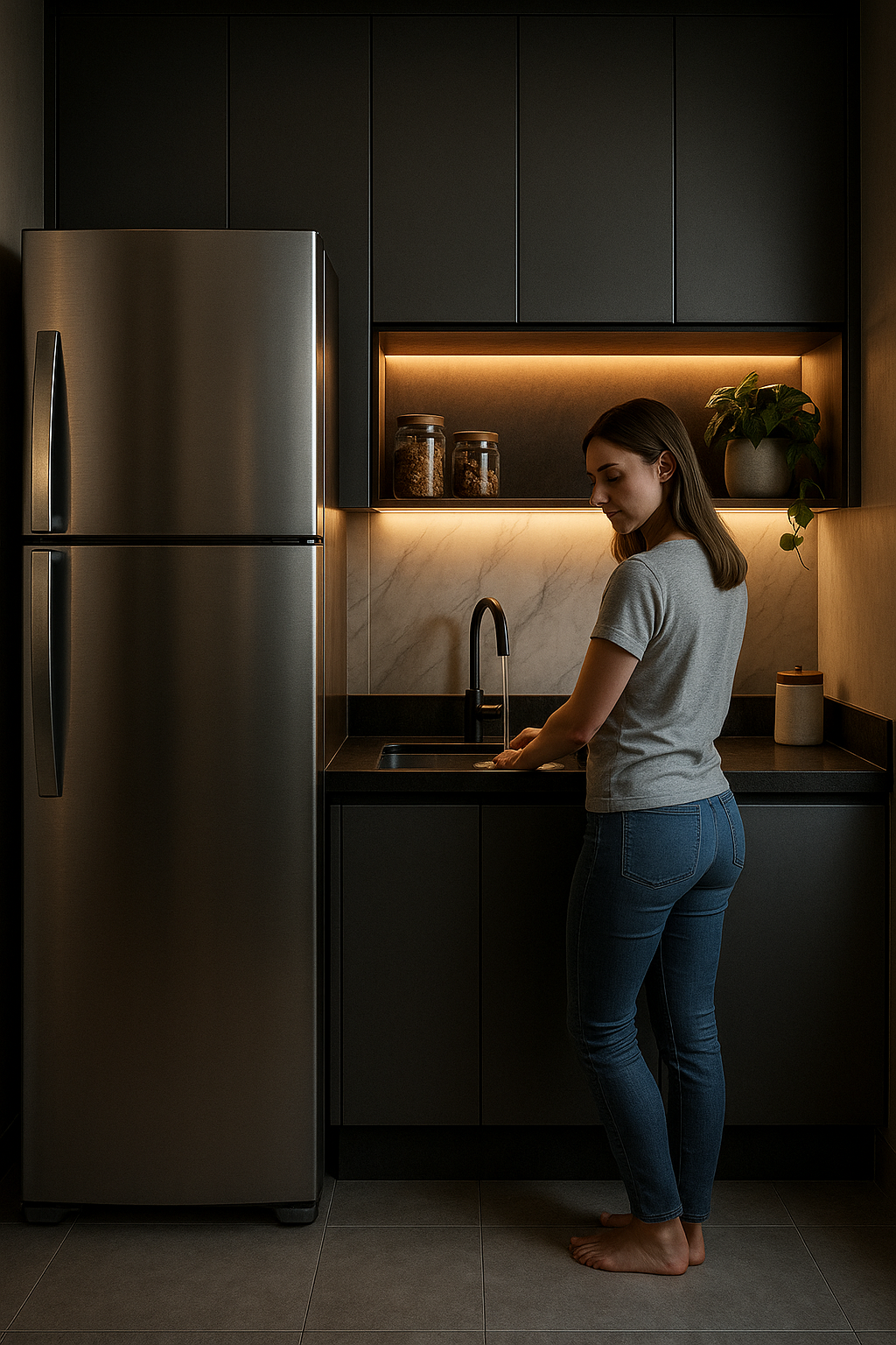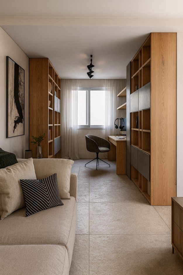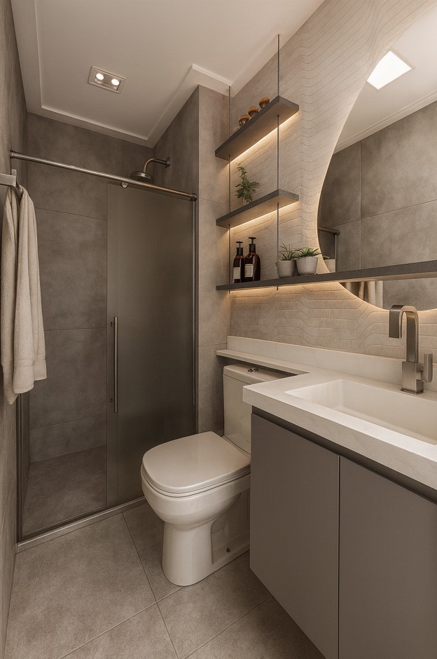 Para os momentos de descanso, o quarto se transforma em refúgio: madeira, tecidos suaves, luz quente e atmosfera calma revelam um espaço que convida a desacelerar. Já o banheiro traz linhas minimalistas e iluminação estratégica, reforçando o clima de spa urbano, perfeito para renovar as energias.