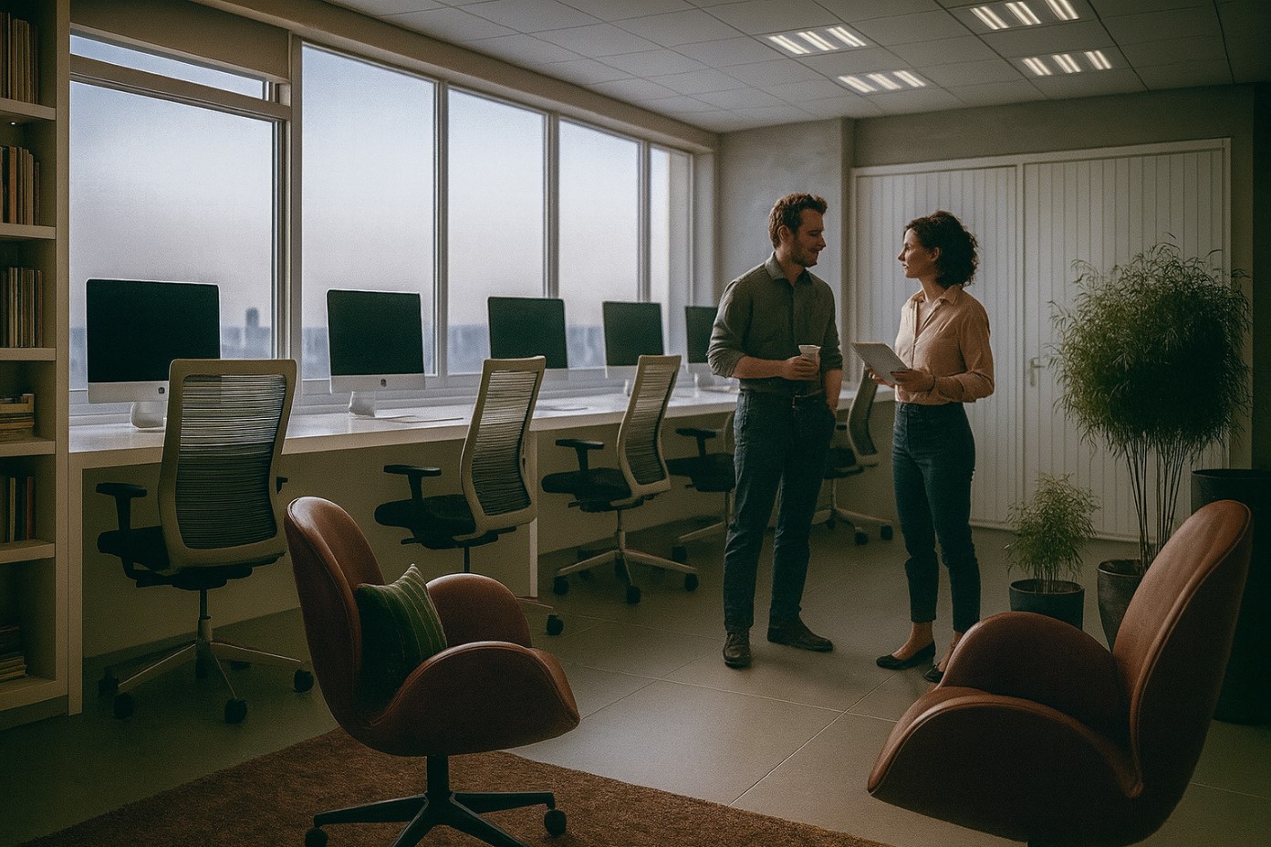 O ambiente foi planejado para abrigar uma equipe de até 5 colaboradores, com estações amplas e bem iluminadas, aproveitando a luz natural que entra pelas grandes janelas.