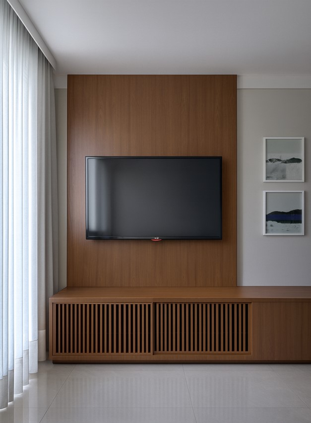 A paleta neutra, marcada por tons quentes de madeira e bases claras, amplia visualmente os espaços e confere sensação de serenidade. A marcenaria sob medida é protagonista: painéis contínuos, volumes limpos e soluções integradas otimizam cada centímetro, trazendo unidade visual e organização.