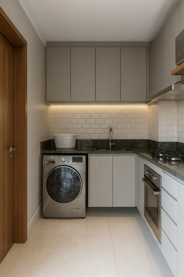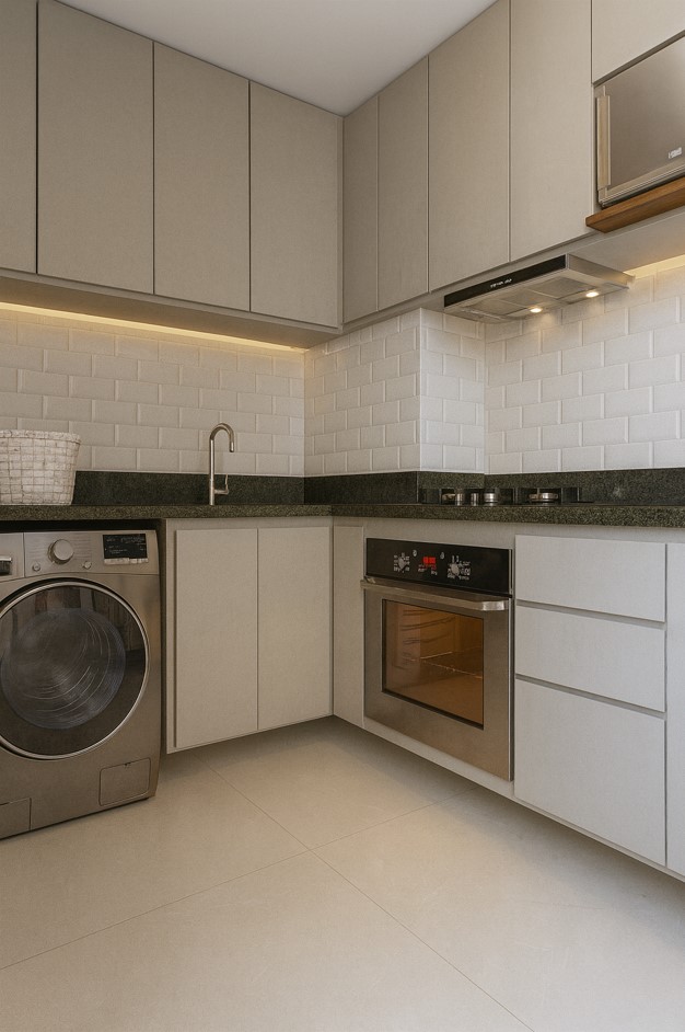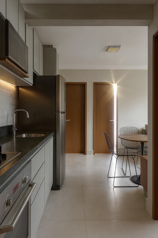A cozinha segue a mesma linguagem visual, com linhas retas e iluminação funcional, mantendo o ambiente prático sem perder a sofisticação. A escolha de materiais atemporais garante durabilidade e beleza, enquanto a composição neutra permite que o espaço respire.