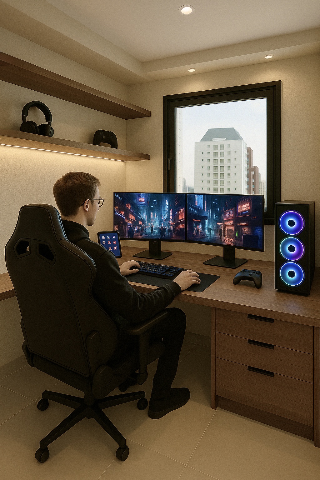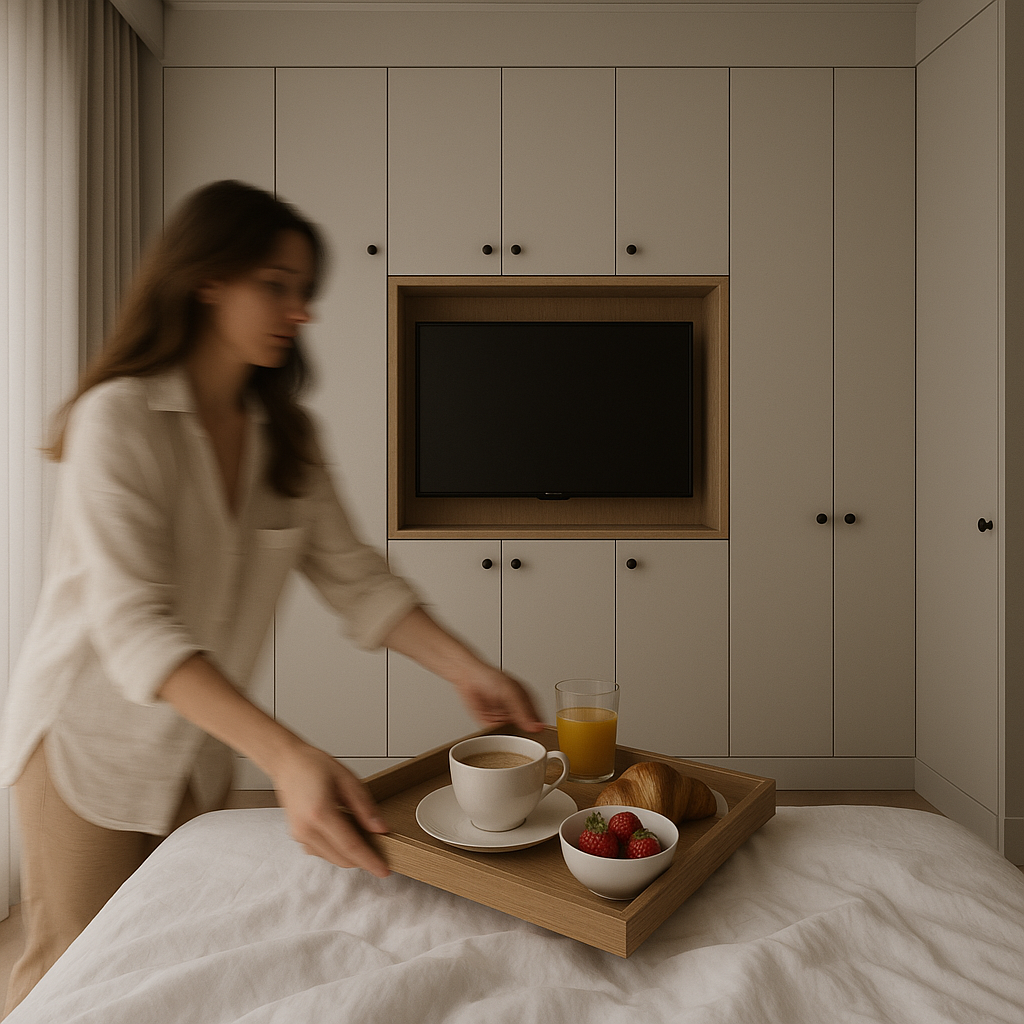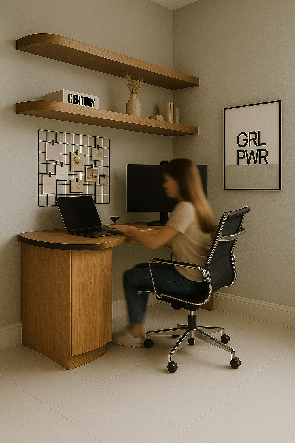 A marcenaria sob medida organiza e integra, enquanto linhas curvas e tecidos macios trazem calor e movimento. O quarto se torna refúgio, o home office convida à concentração e o mobiliário traduz funcionalidade com poesia — tudo em equilíbrio para viver com conforto e autenticidade.